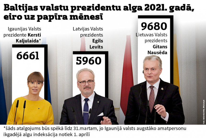 Lietuvas un Igaunijas prezidenti, kuru alga pirms nodokļu nomaksas pārsniedz attiecīgi 9 tūkstošus eiro un 6 tūkstošus eiro, ir labāk atalgoti nekā Latvijas prezidents, kura alga šogad, tāpat kā pērn, nesasniedz 6 tūkstošus eiro. Taču atšķirībā no Latvijas prezidenta, kurš algā uz rokas, visticamāk, saņems vairāk nekā pērn, Lietuvas prezidenta alga pēc nodokļu nomaksas būs mazāka nekā pagājušajā gadā.