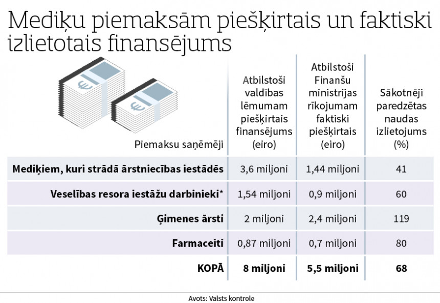 Valsts kontrole revīzijā atklājusi, ka piemaksām faktiski tika izlietota tikai daļa piešķirtās naudas jeb 68 procenti, tātad 5,4 miljoni eiro.