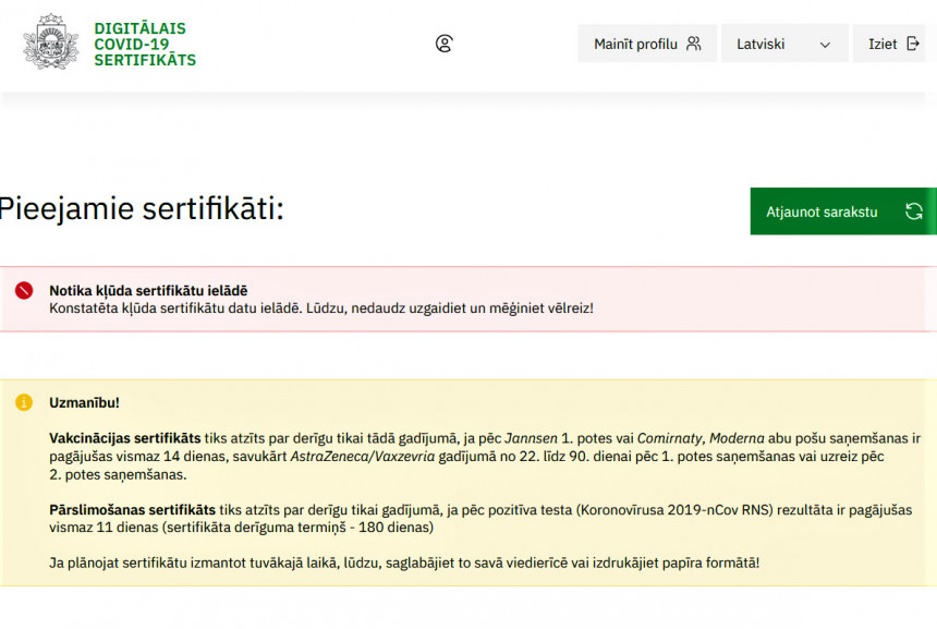 Kopš 1. jūnija vakcinētas vai Covid-19 pārslimojušas personas šo faktu apliecinošu sertifikātu var lejuplādēt savās ierīcēs vai izprintēt no tīmekļvietnes www.covid19sertifikats.lv. Taču sertifikāta esamība vēl nenozīmē, ka tas konkrētā brīdī ir arī derīgs.