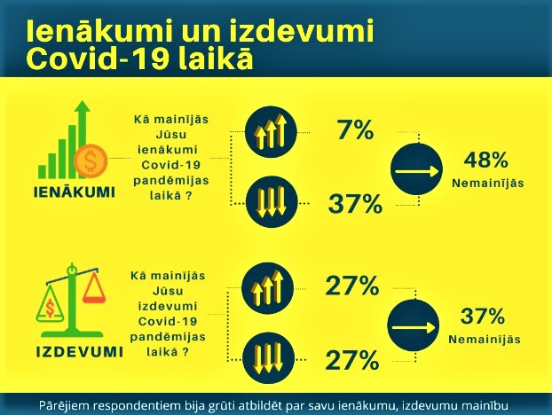 No aptaujātajiem 1023 respondentiem 14% respondentu norādīja, ka Covid-19 otrā viļņa laikā viņu darbavieta bija slēgta uz nenoteiktu laiku un viņi paši saņēma dīkstāves pabalstu, savukārt 5% respondentu zaudēja darbu, jo darbavieta tika slēgta. Respondentu atbildēs par ienākumu un izdevumu mainību Covid-19 pandēmija laikā redzams, ka 37% respondentu samazinājās ienākumi, 48% tie nemainījās, un tikai 7% tie pieauga. Savukārt izdevumi palielinājās 27%, izdevumi nemainījās 37%, savukārt samazinājās 27%.