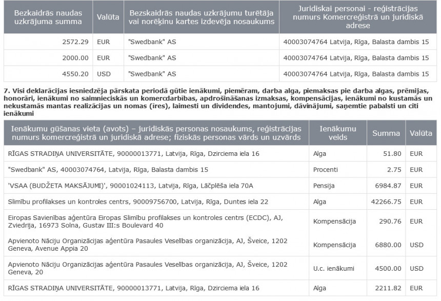 Tāpat arī viņa amatpersonas deklarācijā norādītie ienākumi no Eiropas Slimību profilakses un kontroles centra ir kompensācija par viņa izdevumiem, dodoties uz šīs iestādes organizētām ekspertu tikšanām.