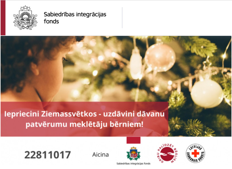 “Labdarības akcija “Dāvana patvēruma meklētāju bērniem” norisinās jau sesto gadu un šogad aicina palīdzēt Rabijai (6), Aleksandram (6), Sofijai (3), Medinai (6), Leilai (13), Muhamedam (1,5) un vēl vairākiem desmitiem bērnu, kuri dzīvo Patvēruma meklētāju izmitināšanas centrā “Mucenieki” vai ārpus tā. Vairumā gadījumu šie bērni ieradušies no tādām valstīm kā Afganistāna, Baltkrievija, Irāka, Krievija, Sīrija un Kongo, kur viņu ģimenes locekļi tikuši vajāti, notiek konflikti vai karadarbība, tāpēc līdzcilvēku atbalsts ir īpaši svarīgs.” Sabiedrības integrācijas fonda direktore Zaiga Pūce uzsver, ka Ziemassvētki un Jaungads ir gada sirsnīgākie un gaidītākie svētki, tāpēc aicina: “Dalīsimies priekā ar tiem, kuriem tas visvairāk ir nepieciešams!”