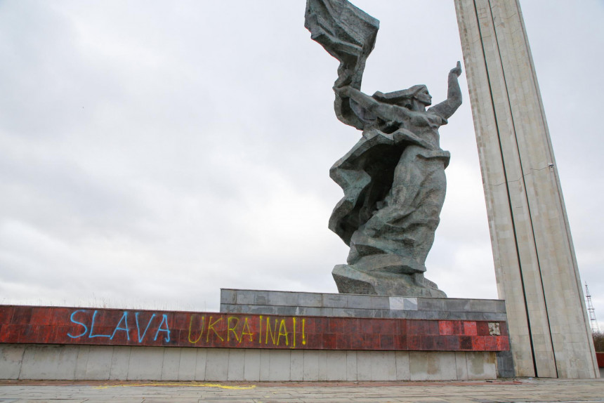 Saistība ir nepārprotama - Ukrainā karš, un sabiedrības naids pret agresoru aug. Veikt pastiprinātu padomju pieminekļu uzraudzību darbiniekiem uzdots no 24. februāra pulksten 16.00 līdz īpašam rīkojumam. Taču - vai nu policijas darbinieki Rīgā šādu rīkojumu nebija vēl izlasījuši, vai arī apzināti pievēra acis - bet 25. februāra rītā “Piemineklis Padomju karavīriem - Padomju Latvijas un Rīgas atbrīvotājiem no vācu fašistiskajiem iebrucējiem” bija apliets ar dzeltenu un zilu krāsu, un līdzās bija uzraksts “Slava Ukrainai!”. Drīzumā krāsa ar atsauci uz Ukrainas karogu un uzraksts tika notīrīti. Toties robs pieminekļa obeliskā paliks uz ilgāku laiku. Iedvesmojies no pieminekļa apkrāsotājiem, atnāca arī kāds vīrs ar nelielu āmuru. Nojaukt gan nenojauca - tas ir Rīgas domes, Saeimas un Ministru kabineta uzdevums -, taču pauda savu pilsonisko stāju un atbalstu Ukrainai.