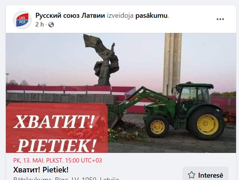 Drošības iestādes rekomendējušas Rīgas domei Latvijas Krievu savienības pieteikto protesta mītiņu nesaskaņot, un pašvaldība tā arī darījusi. Taču šajā reizē agresīvi noskaņotos Kremļa politikas un kara atbalstītājus vairs neinteresē, vai kāds kaut ko ir aizliedzis vai atļāvis. Prokremliskā Latvijas Krievu savienība un tās biedri aktīvi aģitē sociālajos tīklos uz masu nepakļaušanos: “Tagad vai nekad! Neļausim neglābjami pārvērst Latviju fašistiskā valstī! Mums kopā jāiziet un jāparāda vēl neredzēta vienotība, un, ja būs nepieciešams, jāstāv līdz beigām par mūsu pieminekli Atbrīvotājiem!” Tā uz pēcpusdienā gaidāmo nelikumīgo pulcēšanos aģitē pretvalstiskās organizācijas jaunā līdere Tatjana Andrijeca. 9. maijā viņa tika aizturēta par skrejlapu dāļāšanu, taču atkal tika atbrīvota. Aģitē arī vecie līderi. Miroslavs Mitrofanovs aicina cīņā ne par simtiem padomju pieminekļu, bet arī divvalodības saglabāšanu izglītībā. Lai arī savā būtībā pretvalstiski, tomēr šie aicinājumi vēl nesatur vardarbības elementu. Taču tīmeklī krievu sociālajos burbuļos figurē arī daudz agresīvāki uzsaukumi. Turklāt uz pulcēšanos ne tikai šodien pie Rātsnama, bet arī sestdien pie pieminekļa Pārdaugavā.