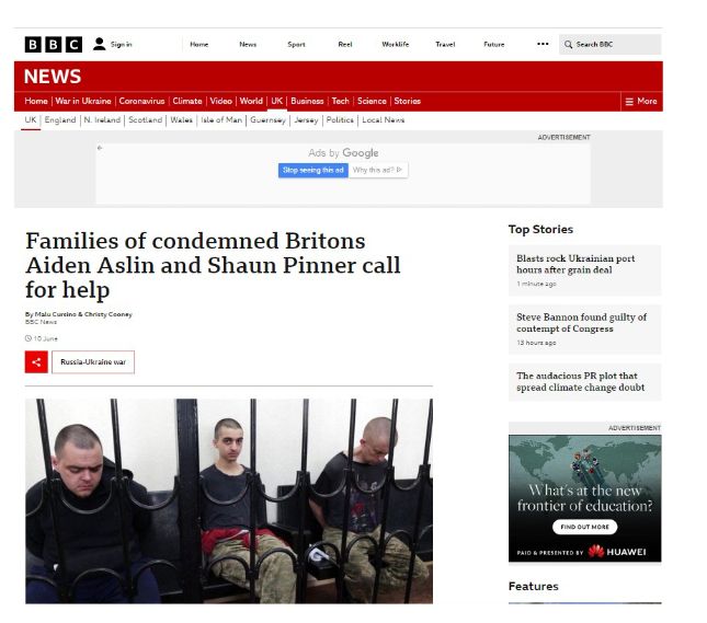 Vasaras sākumā prokremliskie militārie grupējumi Donbasā sagūstīja Ukrainas pusē karojušos ārvalstniekus - Lielbritānijas pilsoņus Šonu Pinneru un Eidenu Aslinu, kā arī Marokas pilsoni Sadunu Bragimu. Politiskā pseidoveidojuma, kas sevi dēvē par Doņeckas tautas republiku, tā dēvētā tiesa jūnijā viņiem piesprieda nāvessodu. Spriedums bija pamatots ar apgalvojumu, ka minētās personas ir nevis karavīri, bet gan algotņi, kurus Ženēvas konvencijas neaizsargā, jo sagūstītie neesot uzskatāmi par karagūstekņiem.