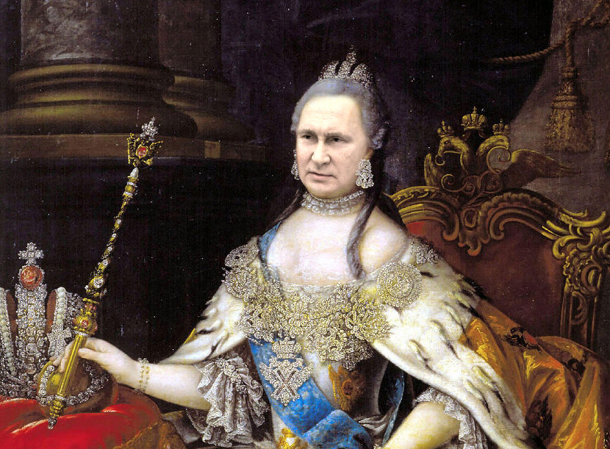 Krievijas pašreizējā diktatora Vladimira Putina manieres atkarībā no situācijas un saviem priekšstatiem par vēsturi uzdoties par vienu, otru, trešo un vēl vairākiem Krievijas iepriekšējiem valdniekiem pašlaik liek viņam spēlēt Katrīnu II, lai iekarotu tās pašas teritorijas, kuras viņa izcilā priekštece savulaik veiksmīgi sagrāba, bet mazāk veiksmīgie priekšteči pazaudēja.