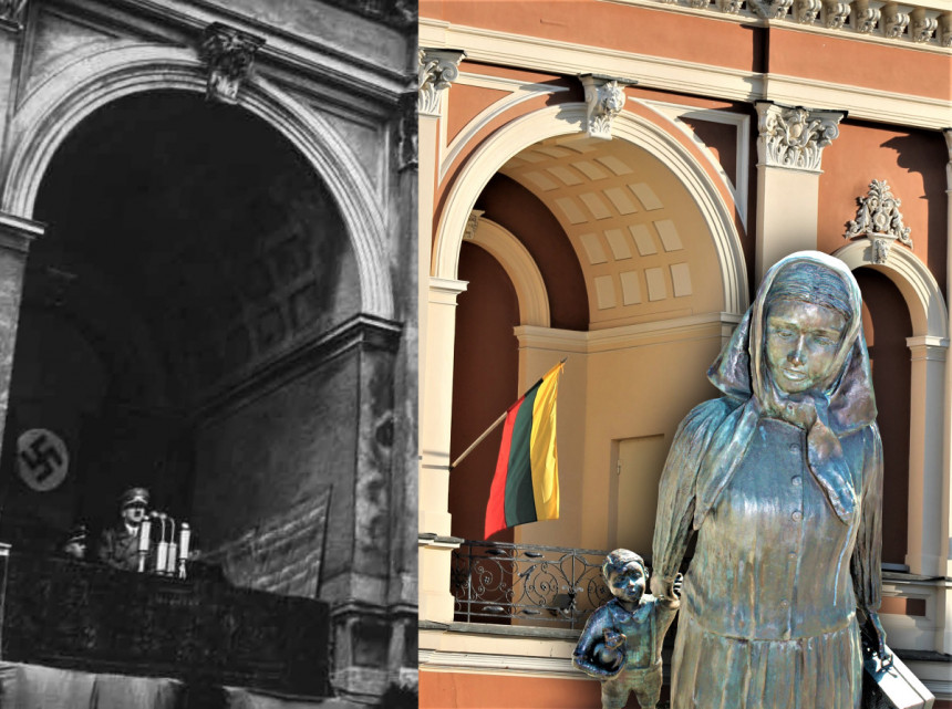 Hitlera uzruna ilga tikai 8 minūtes. Pēc tās viņš atstāja teātri un turpināja braucienu pa pilsētu, lai beidzot atkal atgrieztos ostā. Attēls ar Hitleru uz Klaipēdas teātra balkona ir kļuvis par vienu no Otrā pasaules kara ikoniņām. Interneta plašumos vairākkārt uzieta prakse ir nolikt blakus vēsturisko un aktuālo skatu uz vienu un to pašu vietu. Aktualitāti šeit pārstāv Lietuvas karogs, kura krāsu salikums Baltijā un, cerēsim, Eiropā tikpat atpazīstams kā kāškrusts un Hitlera ūsas. Pie tā paša arī divu skulptūru grupa “Šķiršanās” (Abschied, Atsisveikinimas), kas realitātē kopš 2002. gada atrodas pie Klaipēdas dzelzceļa stacijas. Sievietes un bērna tēli pārstāv vairāk nekā 40 tūkstošus Klaipēdas iedzīvotāju. Tik viņu bijis Otrā pasaules kara sākumā. Kara beigās Klaipēdā no viņiem neesot palicis neviena vismaz pēc lietuviešu versijas, kā viņi tikuši pie Klaipēdas uz mūžīgiem laikiem.