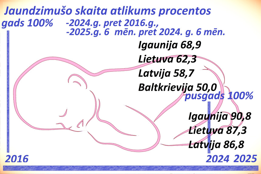 No šīs tabulas redzams, ka jaundzimušo skaits Lietuvā un Igaunijā sarucis zem psiholoģiski vieglāk un tāpēc sāpīgāk uztveramām robežlīnijām, kādas lietuviešiem bija 20 tūkstoši, bet igauņiem - 10 tūkstoši jaundzimušo gadā. Šā gada dati ļauj spriest, cik straujā tempā 10 tūkstošu jaundzimušo robežlīnijai tagad tuvojas Latvija. Mums aktuālā robežlīnija bija 1 000 jaundzimušo mēnesī, zem kuras Latvija palīda pērnā gada novembrī: