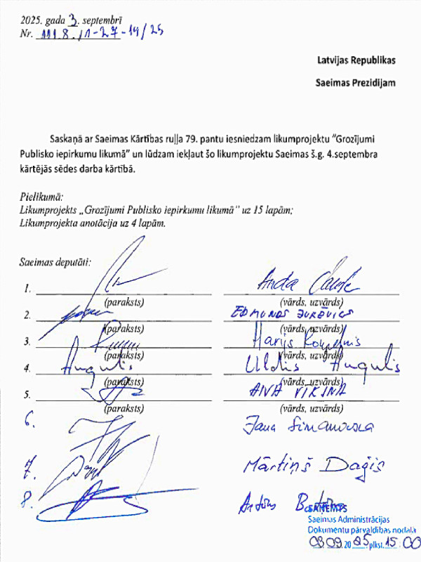 Saeimas Budžeta komisija gatavo otrajam lasījumam grozījumus Publisko iepirkumu likumā. Tagadējais likums tika pieņemts 2016. gada decembrī un kopš tā laika daudzkārt grozīts jeb raustīts. Likumdošanas datu bāzē trīs šā likuma grozījumus paguva atstāt jau likumu pieņēmusī 12. Saeima. Pēc tam 13. Saeimas laikā likums grozīts 9 reizes un pašreizējā 14. Saeima ar likuma grozīšanu atzīmējusies 10 reizes. Šādas darbošanās pašreizējā versija notiek ar lozungu, ka tagad nu gan ūdens smeļas mutē un jāglābj, kas vēl glābjams. Proti, valstij naudas patiešām trūkst un šo iztrūkumu varētu kaut daļēji mazināt, ja izdotos padarīt lētākus valsts un pašvaldību iepirkumus. Šādas idejas autors ir finanšu ministrs Arvils Ašeradens, bet idejas realizāciju ar lielu entuziasmu uzņēmusies Saeimas budžeta komisijas priekšsēdētāja Anda Čakša.