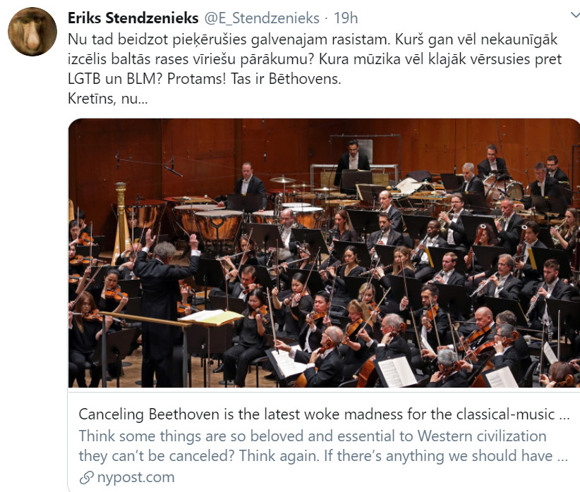 Uz ziņu, ka “Cancel culture” ideologi gatavojas “kancelēt” arī elitārās (tātad balto vīriešu dominanti uzturošas) kultūras pārstāvi komponistu Ludvigu van Bēthovenu, ar sev raksturīgo ironiju atsaucās Ēriks Stendzenieks: Nu tad beidzot pieķērušies galvenajam rasistam. Kurš gan vēl nekaunīgāk izcēlis baltās rases vīriešu pārākumu? Kura mūzika vēl klajāk vērsusies pret LGTB un BLM? Protams! Tas ir Bēthovens. Kretīns, nu...