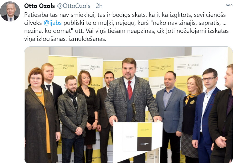 Otto Ozols: Patiesībā tas nav smieklīgi, tas ir bēdīgs skats, kā it kā izglītots, sevi cienošs cilvēks Ivars Ījabs publiski tēlo muļķi, nejēgu, kurš "neko nav zinājis, sapratis, ... nezina, ko domāt" utt. Vai viņš tiešām neapzinās, cik ļoti nožēlojami izskatās viņa izlocīšanās, izmuldēšanās.