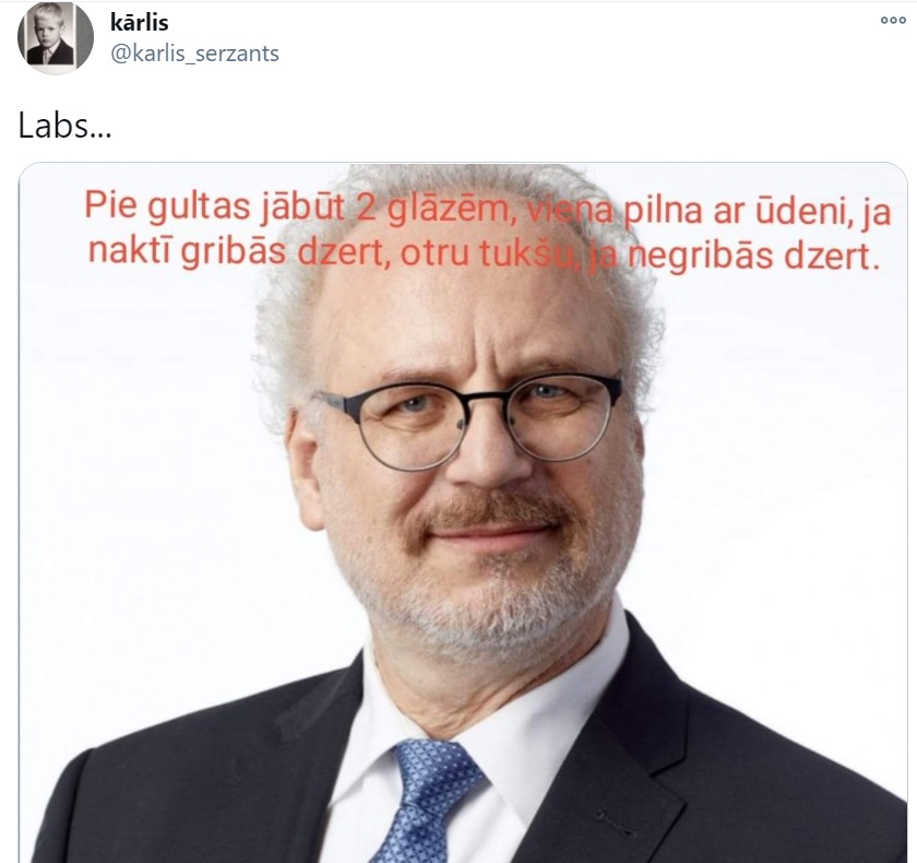 Kārlis Seržants ar īsu ierakstu: Labs... publicējis sociālajos tīklos redzētu bildi, kurā attēlots prezidents Levits un viņa it kā citāts: Pie gultas jābūt divām glāzēm, viena pilna ar ūdeni, ja naktī gribas dzert, bet otru tukšu, ja naktī negribās dzert.