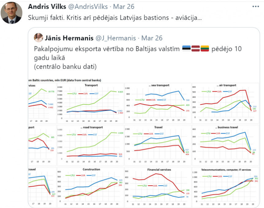 Vilka retvītotajā Jāņa Hermaņa apkopotajā tabulā diemžēl redzama vēl skumjāka aina. Latvija pēdējos gados ir zaudējusi pozīcijas ne tikai aviācijā, bet arī daudzās citās nozarēs - transportā kopumā, finanšu pakalpojumos, telekomunikācijās un IT pakalpojumos, biznesa un cita veida tūrismā. Šiem rādītājiem it kā vajadzētu rosināt sist trauksmes zvanus par to, kas ar mūsu valsti notiek. Kā tā tiek vadīta? Taču nekas tāds nenotiek. Ja arī kāds kusli pakritizē valdību, tad pārsvarā par nejēdzībām saistībā ar pandēmijas ierobežojumiem un vakcinācijas gaitu. Tautsaimniecības vadības jautājumi sabiedrību neinteresē.