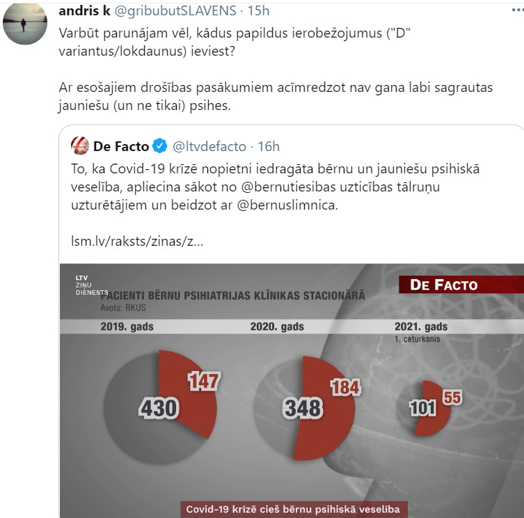 Tas, ka DzS rīkos tikai tad, ja piepildīsies trīs epidemioloģiskie nosacījumi, protams, nav pat pieminēšanas vērts. Galvenais noriet jebko, kas neiekļaujas stingro cietklapētāju “loģikā”. Tajā pašā laikā cita, pēc būtības daudz trauksmaināka ziņa (jo jau ir reāls fakts, nevis tikai hipotētisks kā Dziesmu svētku gadījumā) neizpelnījās tikpat kā nekādu tviterpublikas reakciju. Runa ir par LTV raidījumā “De facto” minētajiem faktiem par to, ka pandēmija īpaši smagu iespaidu atstājusi uz pusaudžu psihisko veselību. Ir ievērojami pieaudzis pašnāvību un to mēģinājumu skaits šajā vecuma grupā.