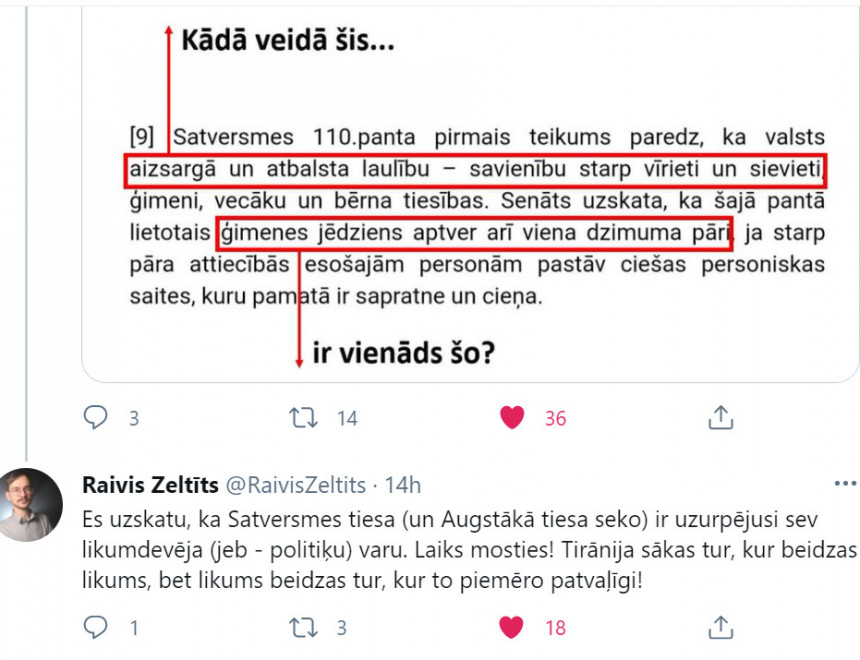 Zeltīts pamatoti norāda: Kādā veidā šis: “Satversmes 110. panta pirmais teikums paredz, ka valsts aizsargā un atbalsta laulību - savienību starp vīrieti un sievieti” ir vienāds ar šo: “Senāts uzskata, ka šajā pantā lietotais ģimenes jēdziens aptver arī viena dzimuma pāri”? Un turpina: “Es uzskatu, ka Satversmes tiesa (un Augstākā tiesa seko) ir uzurpējusi sev likumdevēja (jeb - politiķu) varu. Laiks mosties! Tirānija sākas tur, kur beidzas likums, bet likums beidzas tur, kur to piemēro patvaļīgi!”