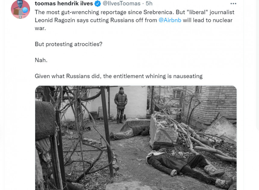 Bijušais Igaunijas prezidents Tomass Henriks Ilvess: “Asinis stindzinošākās reportāžas kopš Srebreņicas laikiem. Bet “liberālais” žurnālists Leonīds Ragozins stāsta, ka krievu izmešana no “Airbnb” īres servisa izraisīšot kodolkaru. Varbūt protestēt pret zvērībām? Ne-e. Ņemot vērā to, ko izdarījuši krievi, vaimanāšana par viņu tiesībām izsauc nelabu dūšu.”