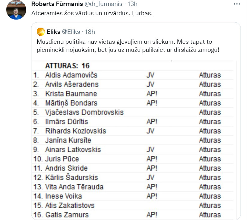 Bet tiem, kuriem ir organisks riebums pret gļēvuļiem, liekuļiem un divkošiem, attēlā saraksts ar uzvārdiem, par kuriem 1. oktobrī noteikti nebalsot. Lai par viņiem balso tie, kuri paši jūtas tikpat “drosmīgi” un “gudri”.
