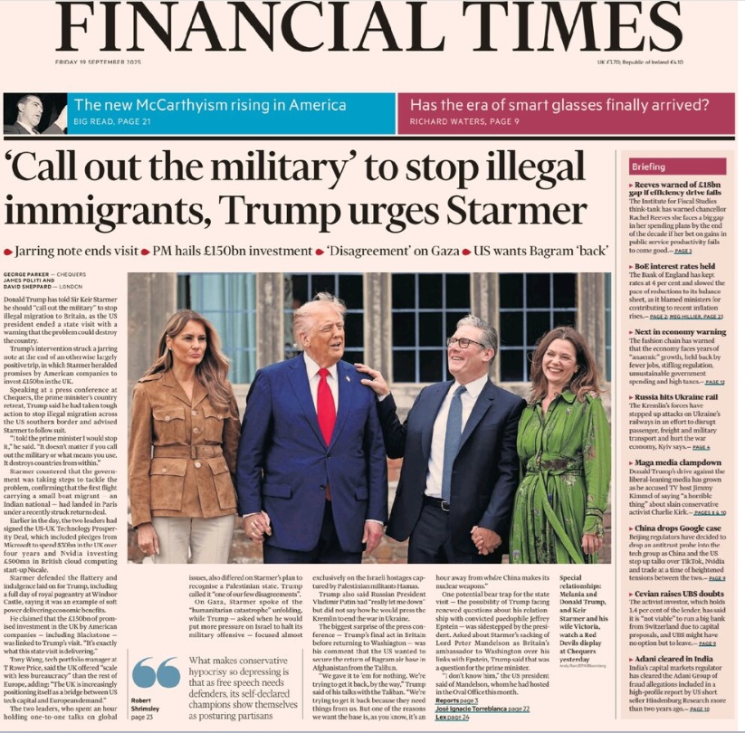 FT norāda, ka “šī Trampa iejaukšanās radīja satraucošu disonansi citādi lielākoties pozitīvās valsts vizītes laikā, kurā Stārmers paziņoja par ASV uzņēmumu solījumiem ieguldīt 150 miljardus sterliņu mārciņu Apvienotajā Karalistē. ASV prezidenta aicinājums Stārmeram glābt savu valsti no nelegālās migrācijas, iesaistot militāro spēku, sasaucas ar Naidžela Farāža vadītās Apvienotās Karalistes Reformu partijas aicinājumiem īstenot daudz stingrāku nostāju šajā jautājumā, tostarp īstenojot “masveida deportācijas””.