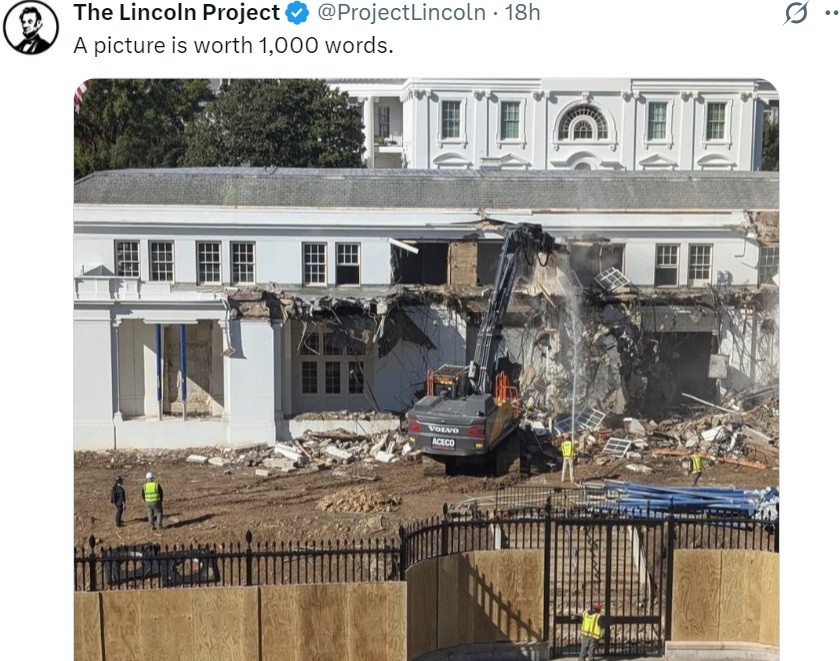 Šobrīd viena no populārākajām fotogrāfijām ASV tīmeklī ir bilde, kurā tiek jaukts nost ASV prezidentu oficiālās rezidences – Baltā nama – austrumu spārns, lai tā vietā uzceltu plašāku banketu zāli saviesīgu pieņemšanu rīkošanai. Šīs fotogrāfijas popularitāte slēpjas tās simbolismā, kuru raksturo tai veltītie komentāri – šis attēls labāk nekā tūkstoš vārdu raksturo to, ko Tramps dara ar ASV.