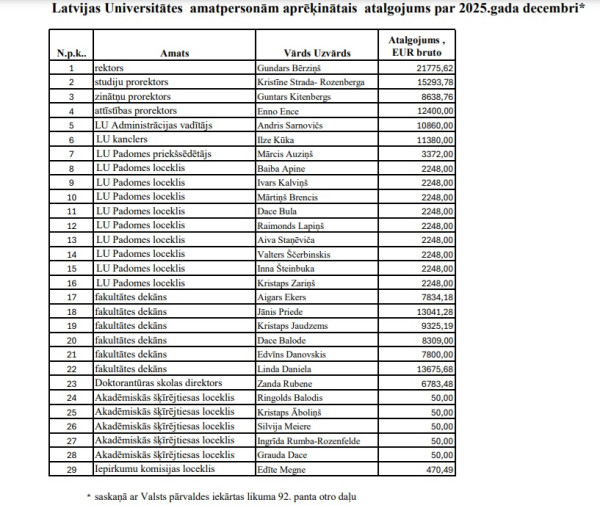 Nupat publiskajā telpā parādījās kārtējās ziņas par “nenormāli” lielajām Latvijas augstskolu vadības algām. Vārdu “nenormāli” lieku pēdiņās, jo tas tomēr ir tāds visai relatīvs jēdziens. Kas vienam norma, tas citam - nenormāls. Latvijas Universitātes (LU) rektoram Gundaram Bērziņam decembra atalgojums (bruto) bija 21 775,62 eiro; studiju prorektorei Kristīnei Stradai-Rozenbergai 15 293,78 eiro; attīstības prorektoram Enno Encem 12 400,00 eiro, bet Ekonomikas un sociālo zinātņu fakultātes dekānam Jānim Priedem 13 041,28 eiro.