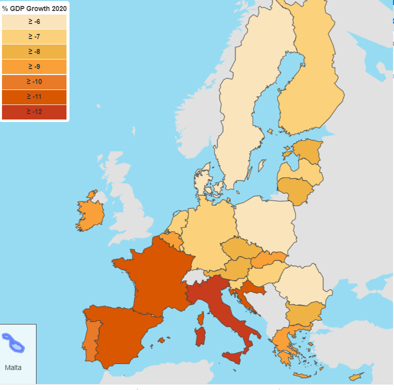 Vakar Eiropas Komisija publicēja ES un eirozonas koriģēto ekonomiskās izaugsmes prognozi, no kuras izriet, ka šogad visā ES notiks ievērojama ekonomikas sarukšana: “Pēc 2020. gada vasaras ekonomikas prognozes, eirozonas ekonomikai 2020. gadā paredzēts samazinājums par 8,7%, savukārt 2021. gadā tā pieaugs par 6,1%. Tiek prognozēts, ka ES ekonomika 2020. gadā saruks par 8,3%, savukārt 2021. gadā izaugsme būs 5,8%. Tādējādi gaidāms, ka samazinājums 2020. gadā būs ievērojami lielāks nekā pavasara prognozē paredzētie 7,7% (eirozonā) un 7,4% (visā ES kopumā). Izaugsme 2021. gadā arī būs nedaudz vājāka, nekā prognozēts pavasarī.”