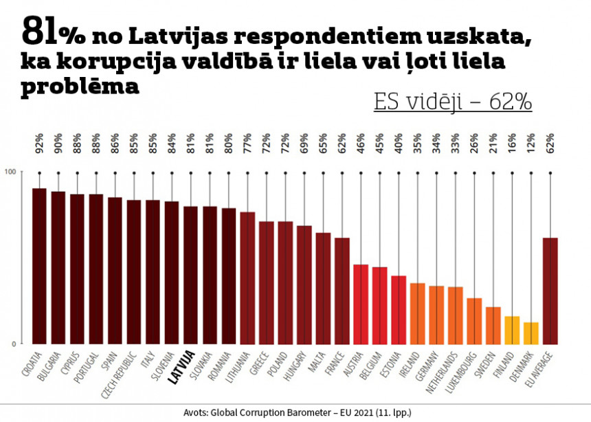 81% no Latvijas respondentiem uzskata, ka korupcija valdībā ir liela vai ļoti liela problēma.