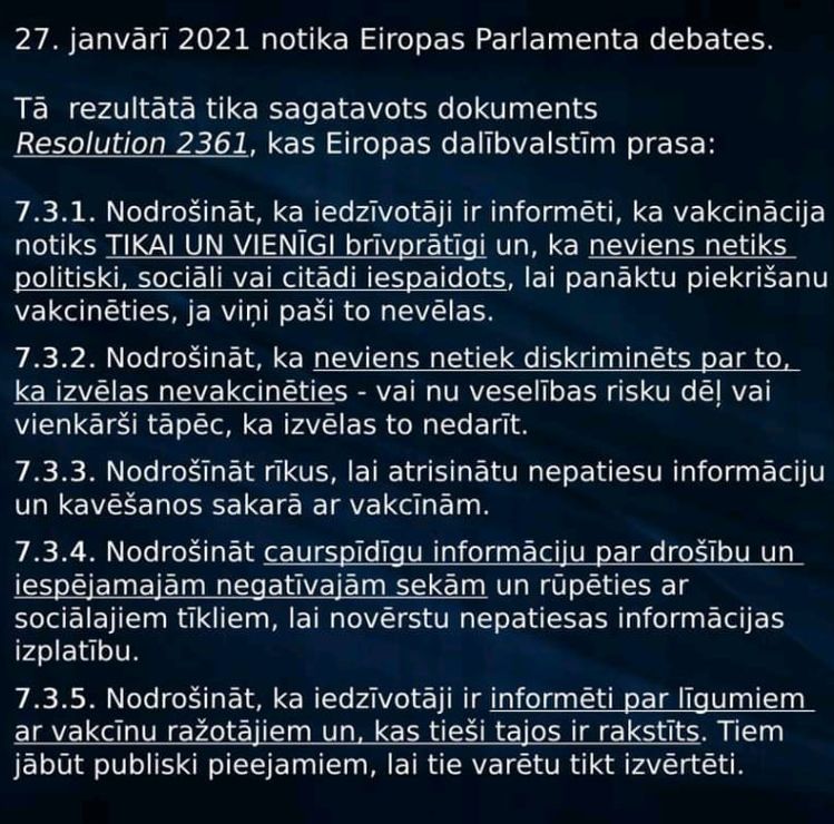 Tātad redzam, ka 27. janvārī ir šī rezolūcija, bet 28. janvārī Pavļuta ministrija tai uzšķauda virsū, uzskatot, ka Eiropas Parlamenta dokumenti tai nav saistoši, jo Latvijā ir tāda tauta, kurai nekādi līgumi par “nebijuša mēroga pasākumiem” un ziņojumi par vakcīnām nav jārāda. Nav jābrīnās, ka šāda slima slepenošanās veicina urbāno folkloru - nostāstus, anekdotes un memes internetā. Kas slēpj no sabiedrības informāciju, tas melo; kas melo - tas zog...
