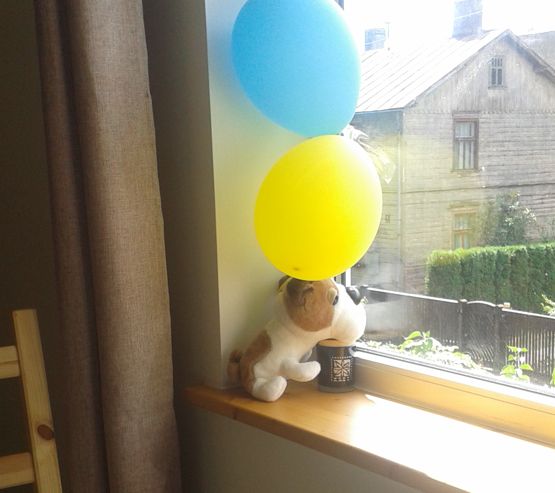 Mazās meitenes ir novietojušas uz palodzes rotaļlietu suni un divus balonus Ukrainas karoga krāsā - vienu zilu, otru dzeltenu. Suns raugās ārā pa logu un sargā māju. “Rrrr!” saka suns. “Ja šurp nāks orki, es viņiem kodīšu! Es esmu lepns un brīvs ukraiņu suns!”