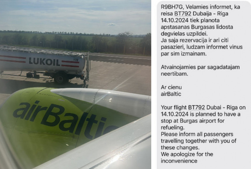 “airBaltic” avioreisa BT792 Dubaija–Rīga 14.10.2024. pasažieris Kārlis (vārds mainīts) “nra.lv” stāsta, ka šī lidmašīna sasniegusi galamērķi ar vairāk nekā divu stundu nokavēšanos. Pa ceļam uz Dubaiju lidmašīna pēkšņi nolaidusies Burgasas (Bulgārija) lidostā, lai uzpildītu degvielu. “Paskatījos iluminatorā un redzēju, ka degviela tiek pildīta no autocisternas ar uzrakstu “Lukoil”.”