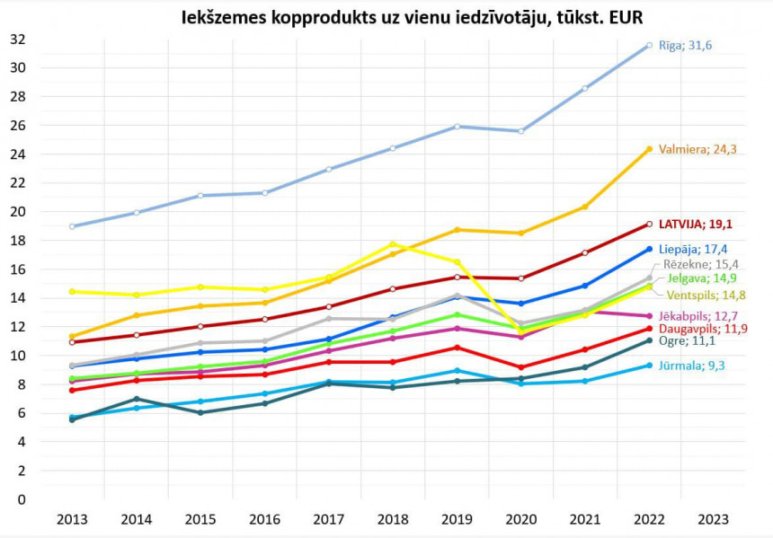 Pie vidējā Latvijā (starp pilsētām) IKP uz vienu iedzīvotāju 19,1 tūkstotis eiro, Rīgā šis skaitlis ir daudz, daudz lielāks - 31,6 tūkstoši eiro.