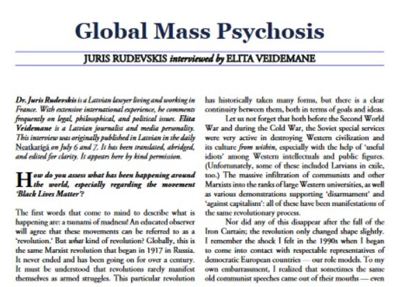 Angļu valodā iznākošā žurnāla “The European Conservative” jaunākajā drukātajā izdevumā ir iekļauta arī Elitas Veidemenes intervija ar juristu Juri Rudevski, kas Neatkarīgajā bija publicēta jūlija sākumā. “Mēs intervijā runājām par pasaules universitāšu krīzi, kas radusies, “pateicoties” kultūrmarksisma uzplaukumam, par joprojām trakojošo neprāta cunami un mūsu politiķu diendusu,” atklāj Elita Veidemane.