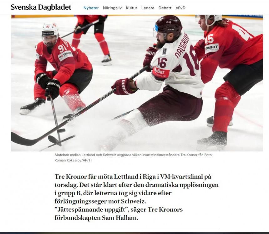 "Latvija pirmo reizi ir gatava pasaules kausa hokejā pusfinālam. "Trīs kroņi" var doties mājās," raksta laikraksts, atgādinot, ka pirms ceturtdaļfināla Rīgā brīdinājis, ka Latvija ir biedējoša pretiniece. Tāpat laikraksts "Swenska Dagbladet" atgādina, ka latvieši progresēja pēc papildlaika uzvaras spēlē pret Šveici.