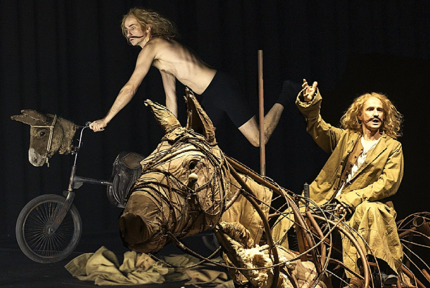 Uzveduma titullomā Kaspars Znotiņš un Sančo Pansas lomā Gundars Āboliņš. Uz skatuves tā arī ir, kā par viņiem kāds no lugas tēliem pasaka, ka “tādus vājprātīgos, kā šis pārītis, pasaule vēl nav redzējusi. Kunga paša murgi bez viņa kalpa muļķībām nebūtu ne plika graša vērti.”