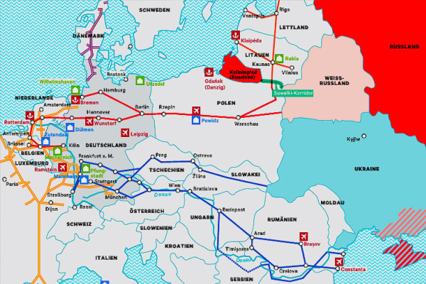 Pirmais apsvērums ģeogrāfisks vai grafisks. Palūkosimies, kā vācieši saskata sevi Eiropas kartē. Tā ņemta no ideoloģijas līmenī visai adekvātā vācu armijas veterānu biedrības žurnāla “Loyal” 2025. gada 3. numura, kur iztirzāti militāro kravu pārvadāšanas maršruti Eiropā: