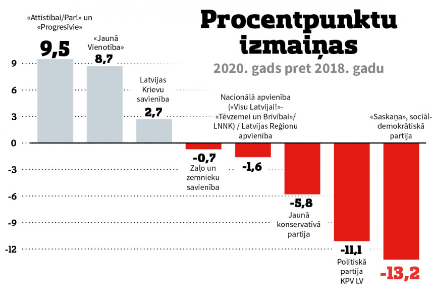 Ja salīdzinām 2018. gada Saeimas vēlēšanu rezultātus ar Rīgas domes ārkārtas vēlēšanu rezultātiem, tad vislabāk savu atbalstītāju skaitu divu gadu laikā ir izdevies palielināt “Attīstībai/Par!”. 2018. gadā par “Attīstībai/Par!” kopā ar sarakstu “Progresīvie” tika nodoti 16,7% balsu. Šogad abu politisko spēku apvienotais saraksts ieguva 26,2% balsu. Popularitātes pieaugums ir 9,5 procentpunkti. “Jaunās Vienotības” popularitātes pieaugums divu gadu laikā ir 8,5 procentpunkti. Visvairāk savus atbalstītājus zaudējusi sociāldemokrātiskā partija “Saskaņa” - mīnus 13,2 procentpunkti, KPV LV ‒ mīnus 11,1 procentpunkts un JKP ‒ mīnus 5,8 procentpunkti.