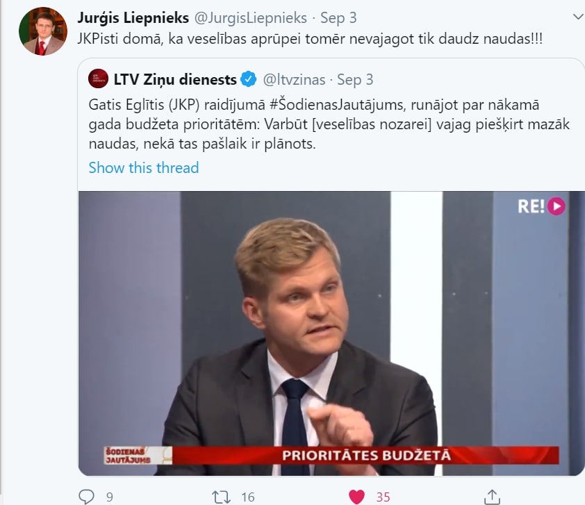 Jurģis Liepnieks: “JKPisti domā, ka veselības aprūpei tomēr nevajagot tik daudz naudas!!!”