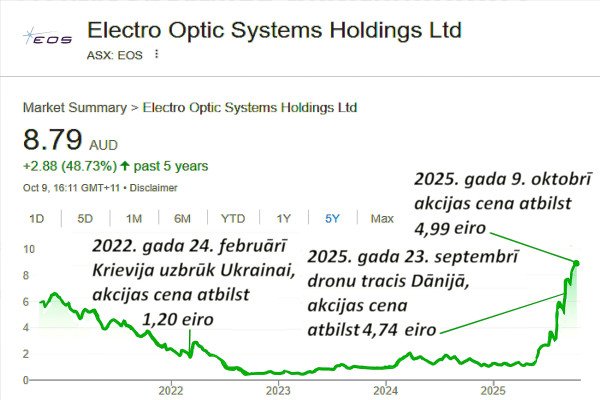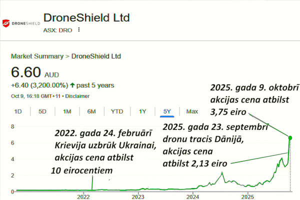 Pirms attēlu rādīšanas vajag atrunāties par neieslīgšanu eiropopcentrismā. Diemžēl vai par laimi, bet Eiropa nav vienīgā vieta pasaulē, kur vajadzīgi pretdronu ieroči. Ukrainas kara dēļ iegūtā pieredze māca, ka tie var izrādīties vajadzīgi pat pašā Austrālijā par spīti tam, ka Austrāliju no tās iespējamiem ienaidniekiem šķir okeāni, kuros attālumi tiek izteikti kilometru tūkstošos. Tomēr praktiski nav iespējams novērst to, ka šos kilometrus pārvar vismiermīlīgākā izskata kuģi, ar kuriem var atvest dronus gan palaišanai no šiem kuģiem, gan iedabūšanai kontinenta dziļumā un palaišanai tieši pie tiem objektiem, kas izvēlēti par reālu vai simbolisku uzbrukumu mērķiem. Tomēr šādi apsvērumi nevarētu nodrošināt pretdronu ieroču ražotāju akciju lēcienu tieši tagad. To nodrošina vairāk vai mazāk ticama informācija, ka šie uzņēmumi dabūjuši vai dabūs eksporta pasūtījumus no maksātspējīgās Eiropas. Lūk, kā šī informācija izteikta naudas, t.i., akciju cenu vienībās:
