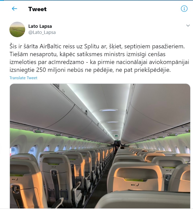 Šovasar Latvijas valsts ar Eiropas Komisijas atļauju ieguldīja savā uzņēmumā “airBaltic” 250 miljonus eiro, kā arī norakstīja 37 miljonus eiro lielus uzņēmuma parādus valstij. Uzņēmums atskaitījās par pirmajā pusgadā iegrāmatotiem zaudējumiem 185 miljonu eiro apmērā. Tādā gadījumā pat pirmklasnieks spēj sarēķināt gada zaudējumus 2x185=370, kuri daudz lielāki par šā gada valsts ieguldījumu summu 37+250=287 miljoni eiro. Tikpat droši zināms, ka aizņemšanās iespējas uzņēmums jau bija izsmēlis un tieši tāpēc tam regulāri nepieciešami valsts naudas dāvinājumi. Šovasar Neatkarīgā jau ir citējusi uzņēmuma finanšu direktora Vitolda Jakovļeva teikto, ka " “airBaltic” vēsturiski ir lidsabiedrība, kurai ir par maz pašu kapitāla. Mēs savu attīstību vienmēr finansējam no aizdevumiem. Ja skatāmies globāli, tad “airBaltic” finanšu svira ir viena no augstākajām nozarē, kas nozīmē to, ka papildu spējas aizņemties ir būtiski samazinātas ". Par noslēdzošo posmu šajā faktu ķēdē kalpo Lato Lapsas 29. septembrī sociālajos tīklos publicēta fotogrāfija ar paskaidrojumu: “Šis ir šārīta “airBaltic” reiss uz Splitu, šķiet, ar septiņiem pasažieriem. Tiešām es nesaprotu, kāpēc satiksmes ministrs izmisīgi cenšas izmeloties par acīm redzamo, ka pirmie nacionālajai aviokompānijai izsniegtie 250 miljoni nebūs ne pēdējie, ne priekšpēdējie.”