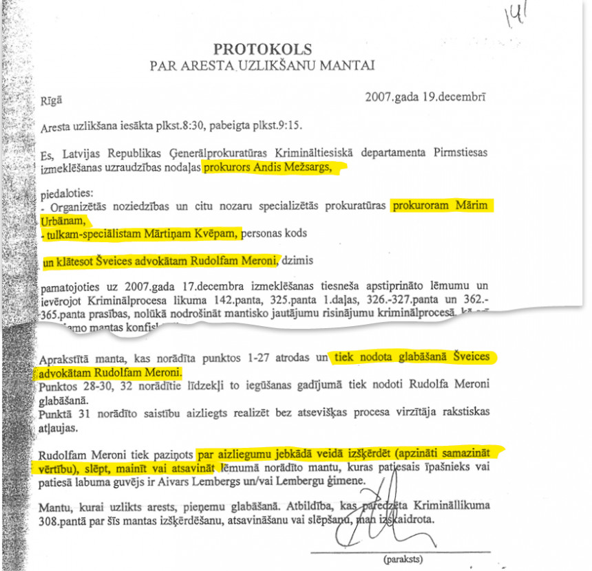 T.s. Lemberga krimināllietas materiālos ir neapgāžami pierādījumi, ka arestētās mantas glabātājs Rudolfs Meroni ir mainījis gan šīs mantas juridisko statusu, gan īpašnieku.