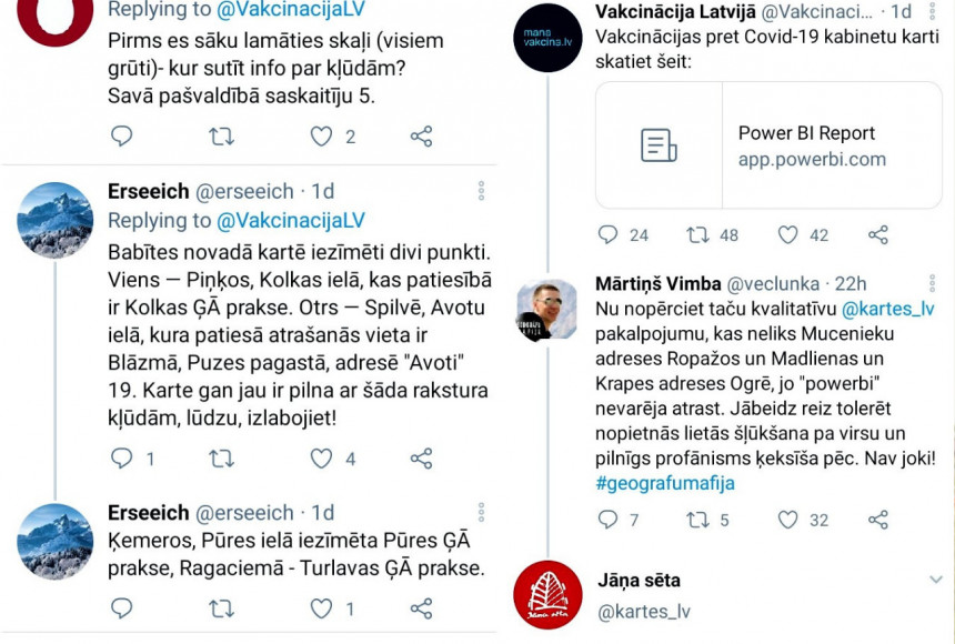 Vakcinācijas kabinetu kartē atrodama informācija par vakcinācijas kabineta atrašanās vietu, tā telefonu numuru, e-pasta adresi (ja tā ir norādīta) un darba laiku. Visnotaļ derīga informācija. Ja vien tā visos gadījumos būtu precīza un izmantotais karšu serviss - vismaz apmierinošs. Taču tā nav. Piemēram, Piņkos, Kolkas ielā iezīmēta ģimenes ārstu prakse, kas patiesībā atrodas Kolkā. Tāpat arī Ķemeros Pūres ielā iezīmēta Pūres Ģimenes ārstu prakse. Twitter lietotāji saskaitījuši daudzas šādas un līdzīgas kļūdas. Karšu izgatavotājs “Jāņa sēta” atzīst, ka karšu serviss, kas tiek izmantots, ir ļoti zemas kvalitātes, un solījās palīdzēt. Karte šobrīd atrodama šeit. Jācer, ka drīzumā, kad seniori meklēs informāciju par vakcinācijas iespējām, kļūdas būs noverstas.
