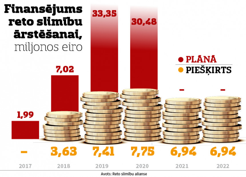 Lai arī pēdējos gadus reto slimību ārstēšanai uz papīra plānots piešķirt vairāk nekā 30 miljonus eiro, reāli piešķirti tikai septiņi miljoni, un ar tiem visu pacientu ārstēšanai ar atbilstošiem medikamentiem nepietiek. Nepietiekams finansējums cilvēku veselības glābšanai ir tikai viens no iemesliem, kāpēc pacienti aicina izstrādāt skaidru plānu.