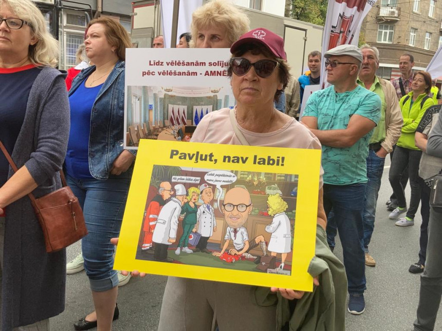 “Pavļut, nav labi!”, “Es gribu pie ārsta šodien, bet ne pēc nāves!”, “Līdz vēlēšanām solījumi, pēc vēlēšanām amnēzija?”- šos un citus plakātus rokās turēja mediķi, kuri pulcējušies ne tikai no Rīgas, bet arī tālākiem Latvijas reģioniem - Valmieras, Strenčiem, Aknīstes, Rēzeknes un citiem. Visi mediķi ir vienoti savā prasībā - nodrošināt medicīnā strādājošiem cilvēka cienīgu algu, izpildot jau pirms vairākiem gadiem doto solījumu katru gadu palielināt medicīnā strādājošo algas.