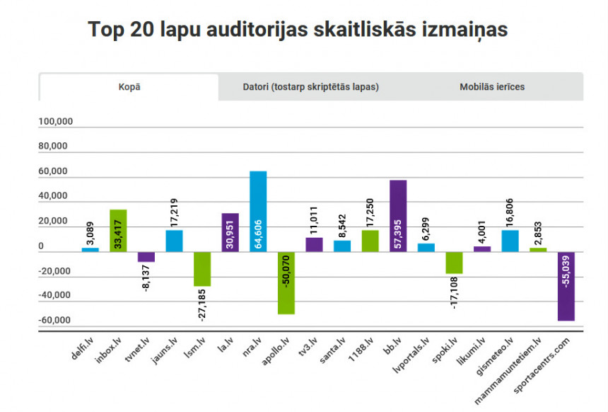 Among the top websites, sportacentrs.com saw the biggest drop in audience in March, with 55,000 fewer users than in February, while apollo.lv also saw a 50,000 drop, with 541,000 readers in March, and spoki.lv saw 17,000 fewer users than in February, with 268,000 users across all devices combined. In March, press.lv and sportazinas.com returned to the top, while diena.lv and liepajniekiem.lv left the top.