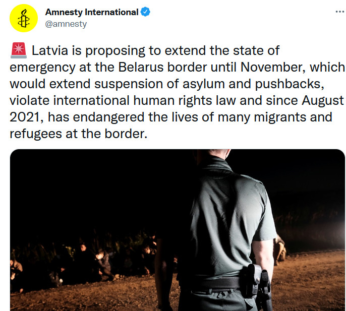 "Latvian authorities must NOT renew the state of emergency and should instead urgently withdraw it and restore the right to asylum in the country for everyone seeking safety, irrespective of who they are or how they crossed the borders!" Assuming in good faith that human rights organization Amnesty International is being misled about the true circumstances of the migration crisis and its management, Neatkarīgā has contacted the organization to ask it to clarify the sources of its information. Perhaps they will reply.
