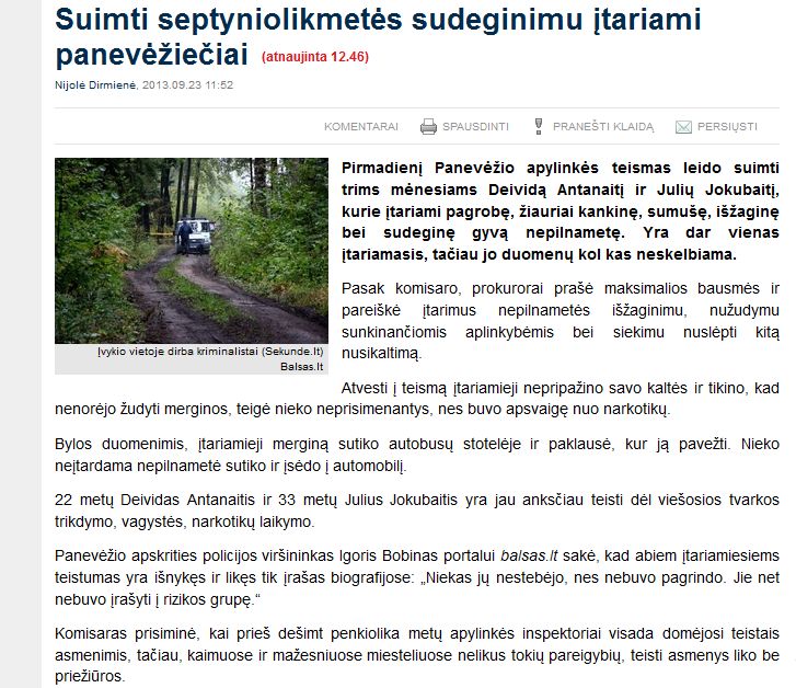 Lietuvu šokējis īpaši nežēlīgs noziegums, kas šoreiz pievērsis arī valsts augstāko amatpersonu uzmanību, - netālu no Panevēžas naktī uz sestdienu izvarota un vēlāk automašīnā sadedzināta 17 gadus veca meitene, vēsta portāls "Balsas.lt".
