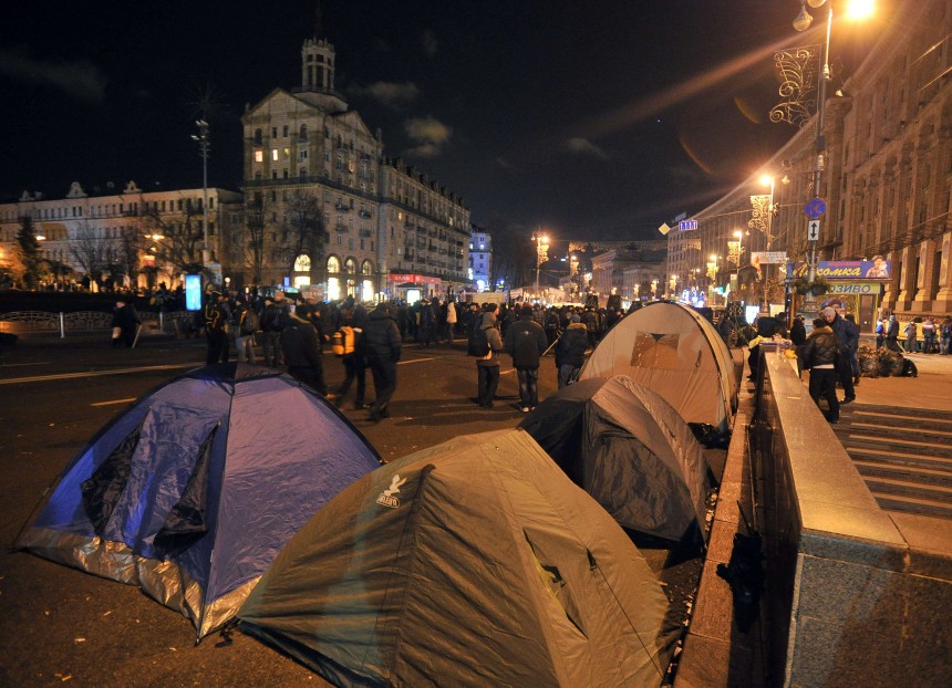 Cilvēkus protestētāju nometnē Kijevā ik pa laikam no skatuves uzmundrina ukraiņu dziedātāja Ruslana, skan ukraiņu mūziķu ieraksti.
