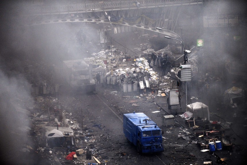 Uz skatuves uzstājas aktīvisti, katru stundu skan Ukrainas himna, Maidana pašaizsardzības vienības apsargā barikādes.