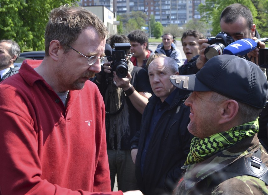 LETA jau ziņoja, ka promaskaviskie separātisti 25.aprīlī Slovjanskā sagrāba gūstā astoņus EDSO novērotājus no Vācijas, Dānijas, Polijas, Čehijas un Zviedrijas, kā arī četrus ukraiņus. Teroristi paziņoja, ka oficiālo delegāciju uzskata par "karagūstekņiem", pieļaujot, ka viņi varētu tikt atbrīvoti apmaiņā pret arestētajiem separātistiem.