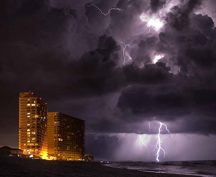 Aculiecinieki tviterī ziņoja, ka saulaino diena pēkšņi nomainījis pērkona negaiss un pludmali skārusi milzīga zibens bulta, izraisot paniku cilvēku vidū.
