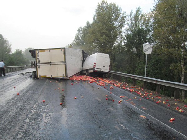 Vienai no kravas automašīnām sadursmes brīdī tika norauta pasažiera kabīne, kura aizlidojusi vairākus desmitus metru. Tāpat pa ceļu tika izkaisīti augļi, kurus veda viena no kravas automašīnām.